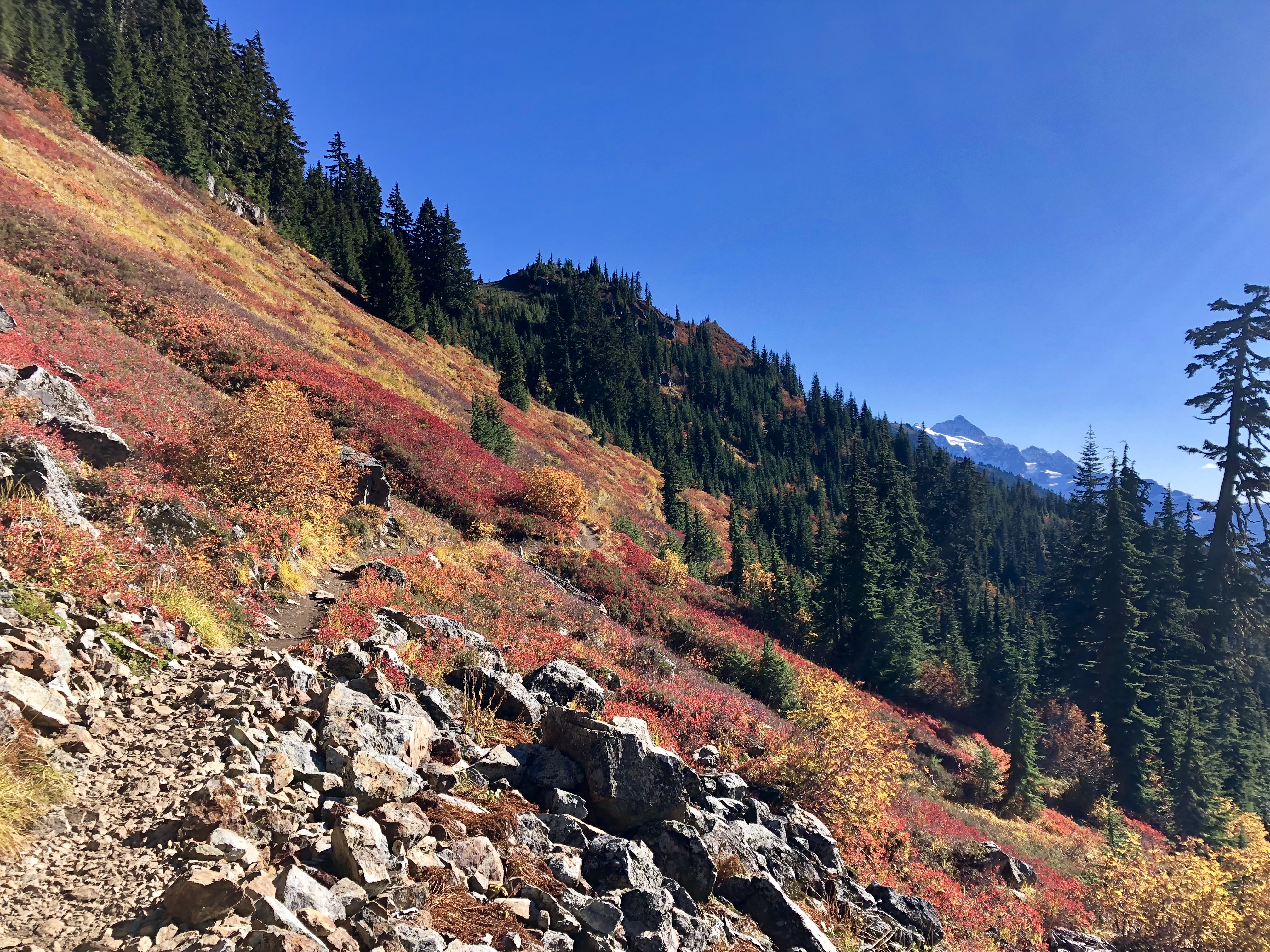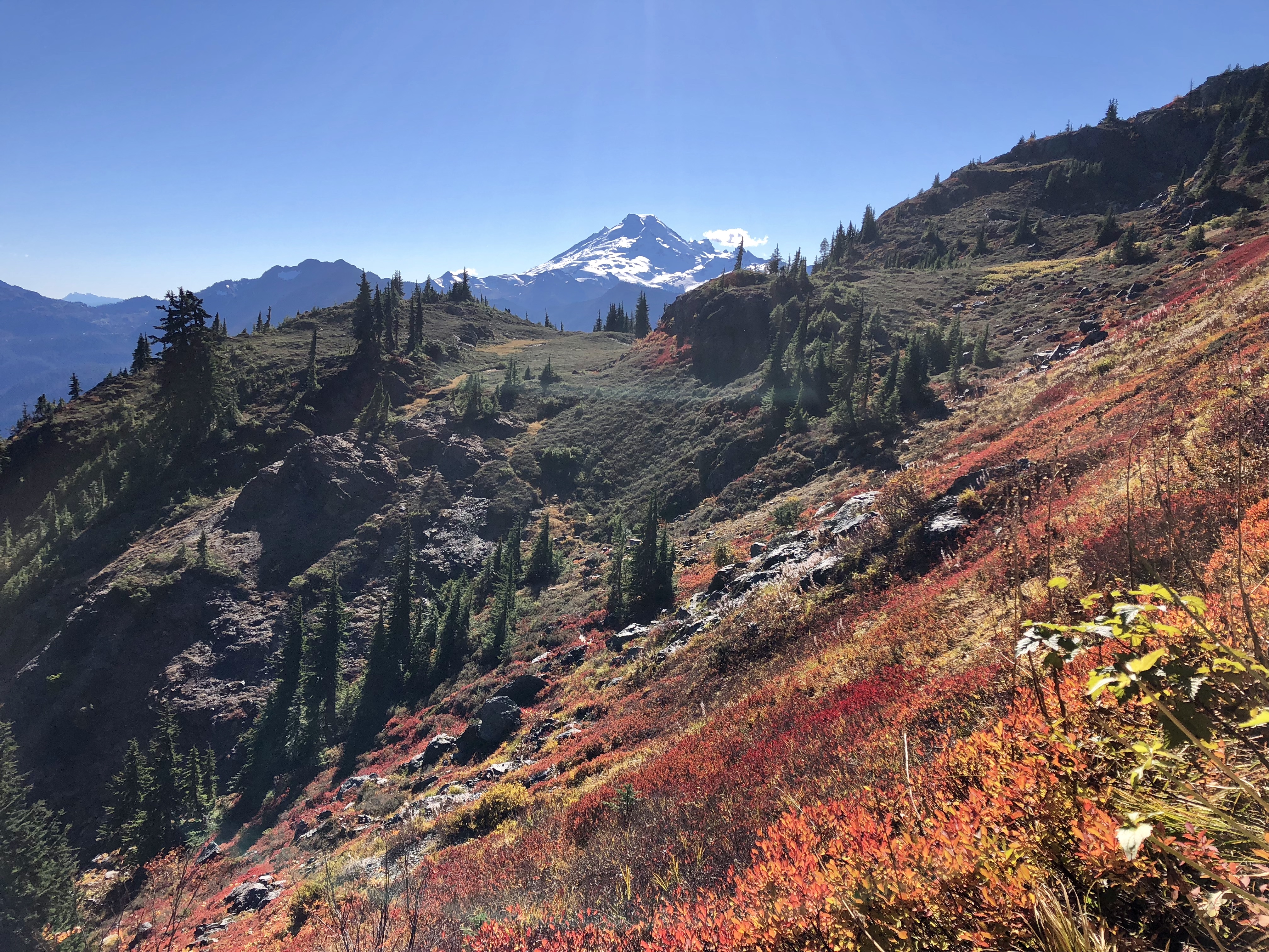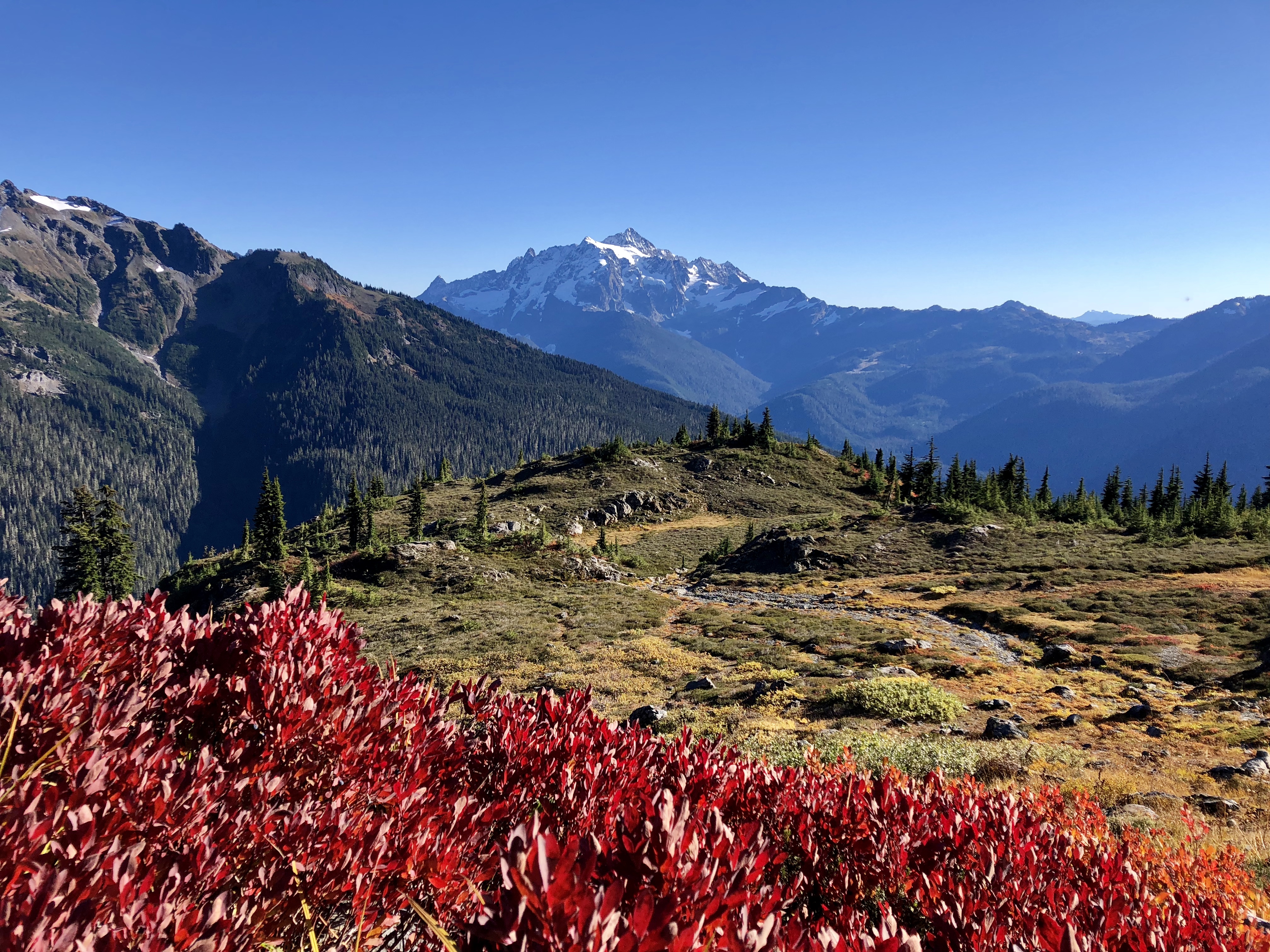 Oh my autumn! The punchy contrast of firey fall colors against a crisp blue autumn day delivered just the hiking fix I needed in mid-October. In the foreground, Yellow Aster Butte presents picturesque rolling hills carpeted in auburn, ruby, sienna, mustard and every color in-between. In the distance, we were treated to visuals of the Cascades and Mt Baker with early-season snow. It was a fun change to pay more attention to the details in nearby shrubs and foliage instead of just macroscopically looking out to views in the distance. While the elusive #larches were trending on the ‘gram in Fall 2018, I’d assess that #autumnshrubs are da real MVP.