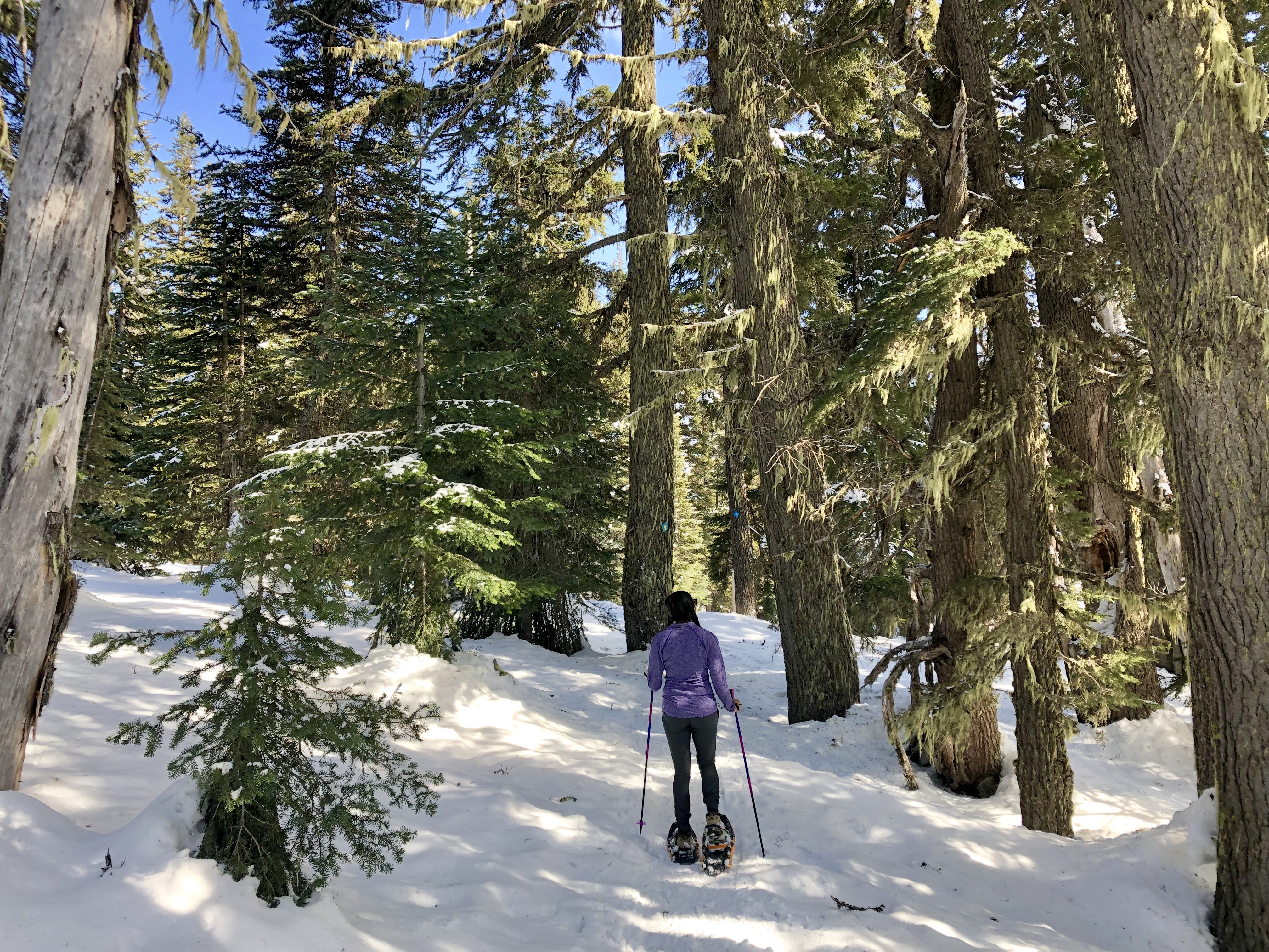 The trail started from the Dutchman Flat Sno-Park, across the freeway from the Mt. Bachelor ski area. A sno-park pass is required to park at the trailhead. The parking lot has a good map, as well as paper maps you can take with you and a pit toilet. The trail winds through a nice combination of forested areas and clearings that frame Mt. Bachelor and the Three Sisters mountains. The rolling hills were mild and the trail did not feel crowded. Although it was difficult to find digital information on the trails, the signage and organization of the trails themselves was phenomenal. Snowshoers, skiers and snowmobilers share the park, however, separate trails have been created so everyone can enjoy the area safely. The snowmobile areas were separated enough that we were able to enjoy the quiet and skiers had their own separate trails so snowshoers wouldn’t step on their carved out tracks. Wayfinding can often be difficult when trails are covered in snow but this park was extremely well signed. Overall, the setup was impressively thoughtful in its layout.