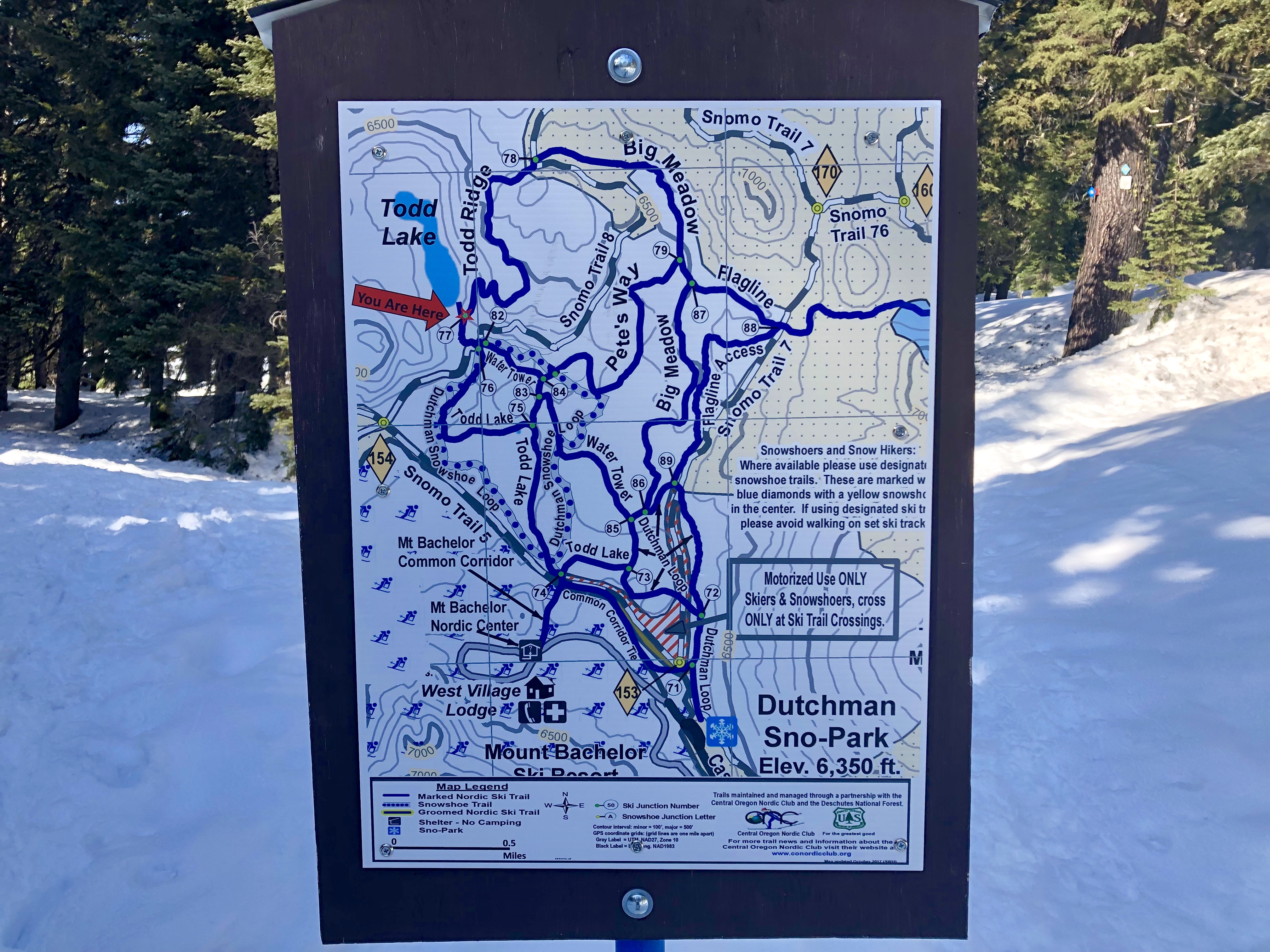 After previously living in Portland for a few years and then recently moving back to Washington, every time I visit Oregon to explore, I am reminded of what a blessing the Washington Trail Association website is. I’ve always found it very difficult to find good online information on less frequented trails in Oregon, which is actually part of the reason I decided to start this blog. In the absence of information on trails off the beaten path and winter road accessibility, we asked some locals for recommendations. We were recommended Spirit Lake on Mt Bachelor so we headed up Century Drive from town. After some GPS mishaps and wrong turns, we discovered that the road was snowed in and closed for the winter. We noticed signs for several sno-parks on the way up so we decided to embark on a true adventure by exploring a trail we hadn’t planned on. We pulled into the next sno-park that we found and picked a snowshoeing trail off the map in the parking lot – Todd Lake, 6 mi round trip.