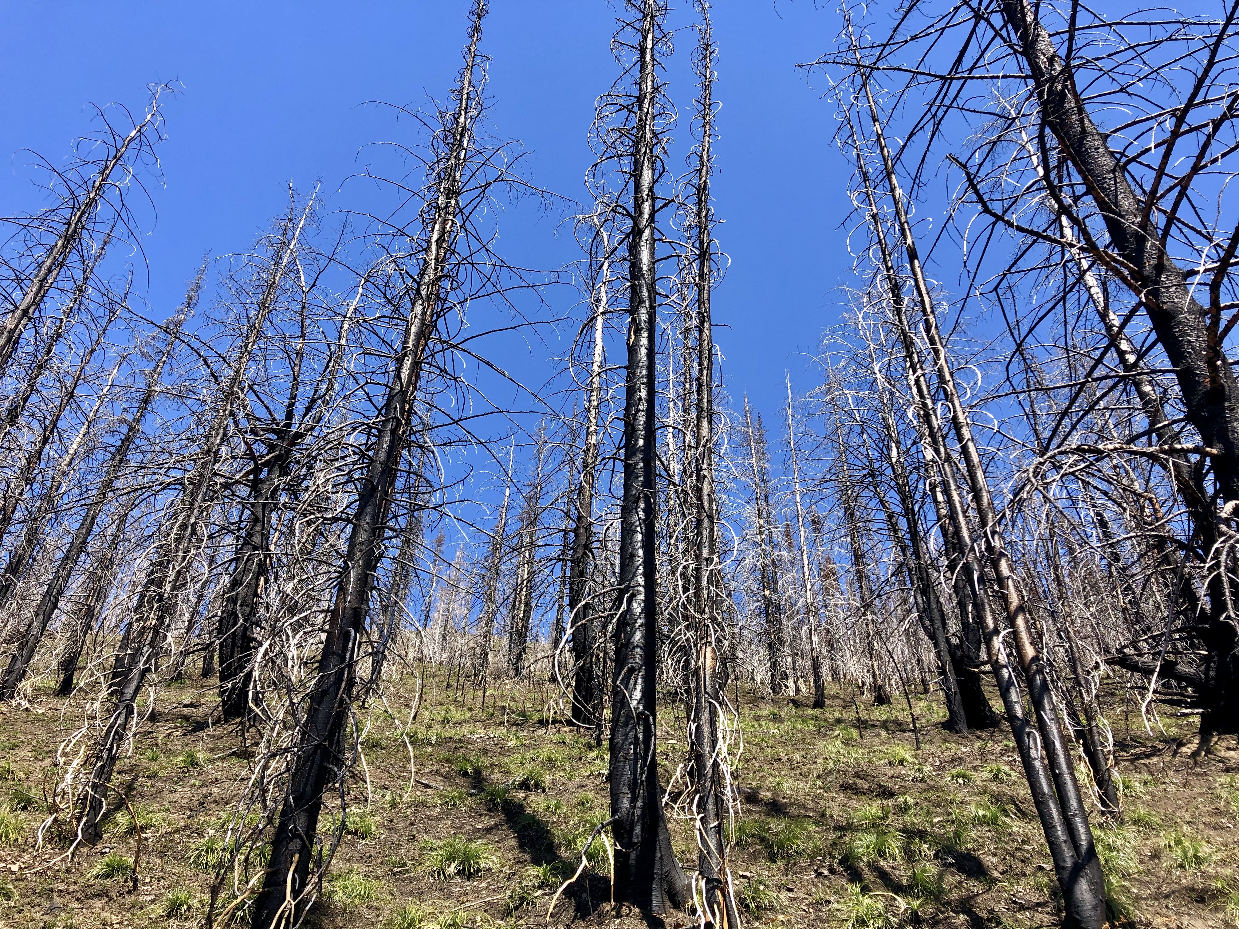 The trail starts on a forest road but quickly turns left onto a proper trail. The first ⅔ of the trail are wooded switchbacks that follow a fairly consistent and comfortable grade. There are a handful of offshoot trails along the way – stay the main trail to reach Norse Peak. About 2-3 miles in, you’ll begin to see the aftermath of last summer’s fire – charred trees and wood. We hit snow about ⅔ of the way up around 6,000 feet. The snow was very slushy and while I used Yak Trax for traction, nobody else in my group did and the snow is totally passable in normal hiking boots. The very last push is steep and requires a bit of wayfinding. Though the trail had low traffic, there were enough footprints in the snow for us to follow along successfully. After an exhausting, snowy final stretch, it was tempting to call the first few steps along the ridgeline the “summit”. However, the true summit is about a half mile walk along the ridgeline. You’ll know you’ve reached it when you see the large rock pit formation, where we ate lunch.