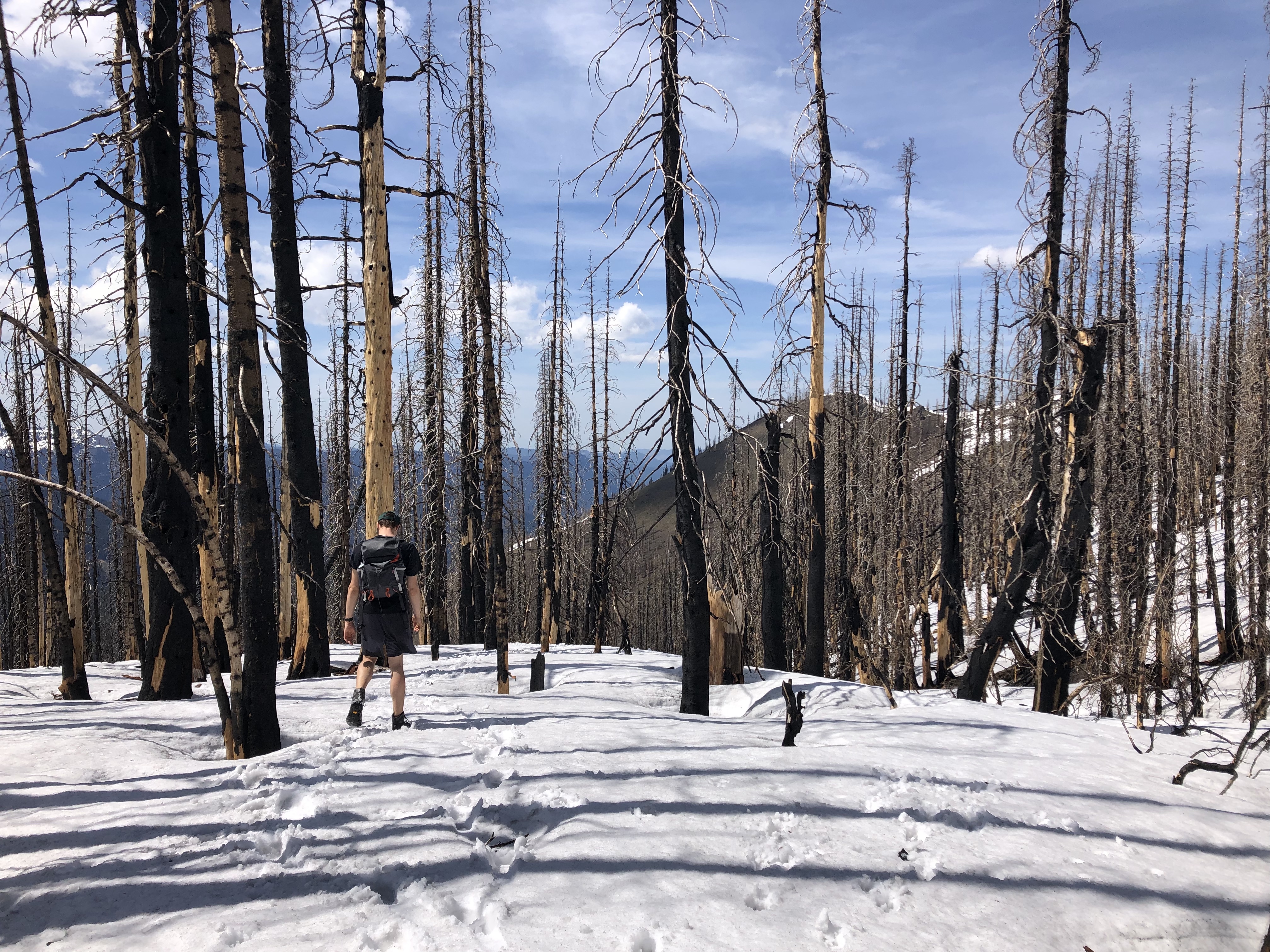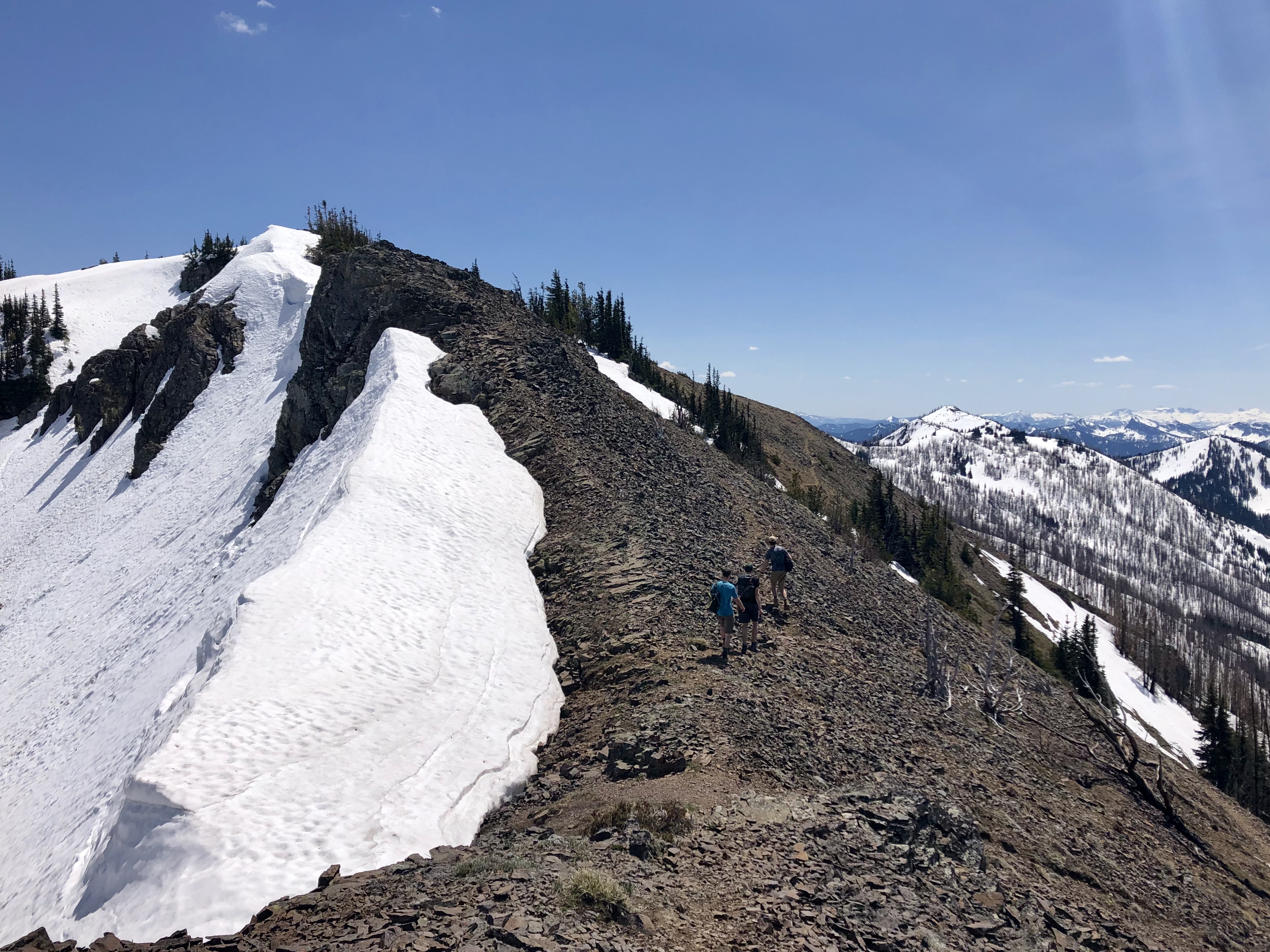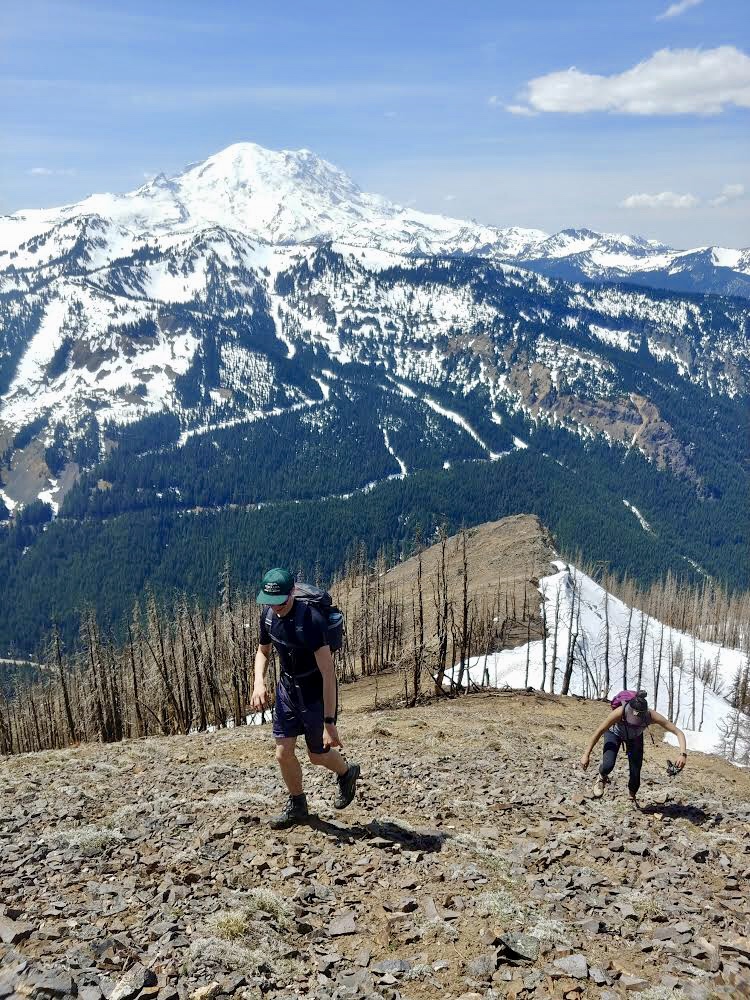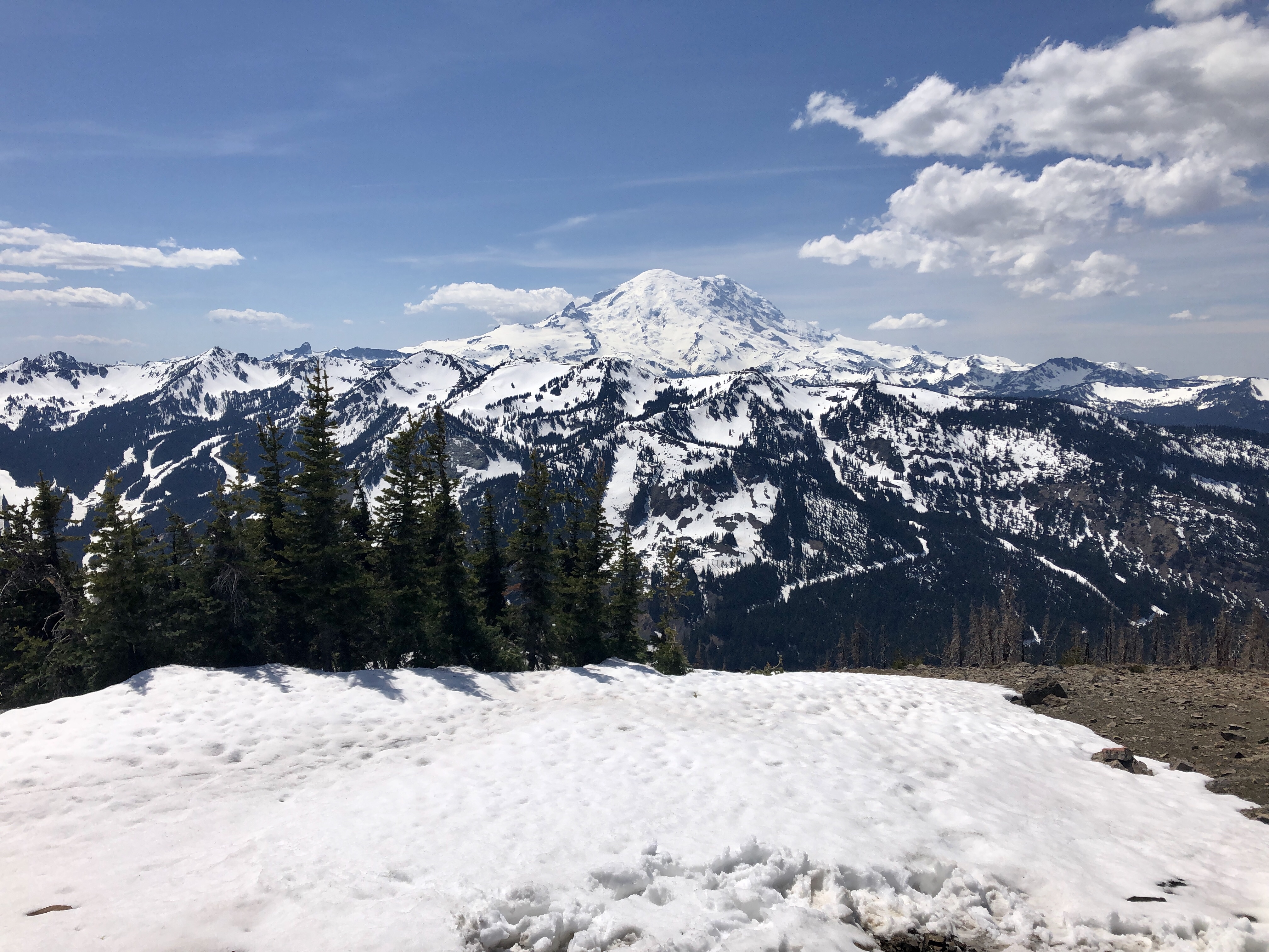 My first big hike of the year set the bar high for the rest of the season. We caught glimpses of Rainier and Crystal through the charred trees all the way up but nothing compared to the panoramic views once we reached the upper ridge. There we found layers upon layers of blue mountain ranges in the distance with snow-capped peaks and green valleys in the foreground. After a snowy scramble to the top and a scenic ridge line traverse, we enjoyed a peaceful lunch with the sunny summit all to ourselves.