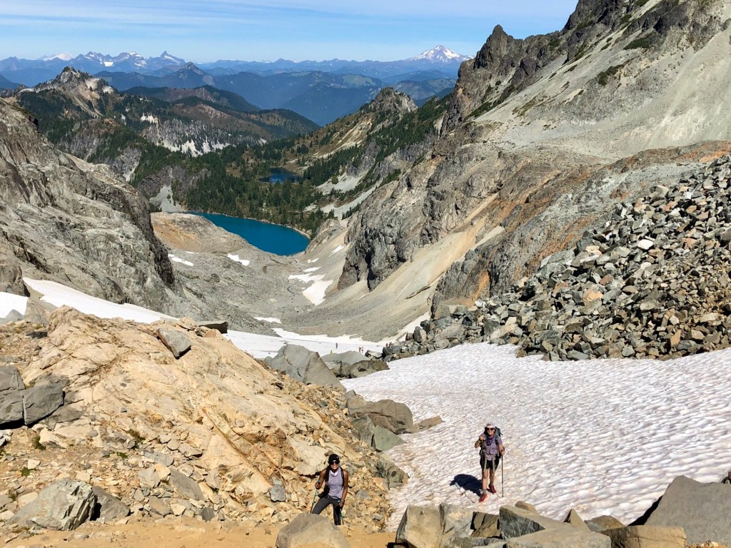 Although steep and punishing, the trek was made instantly worthwhile when we got our first view of Pea Soup, right at the top of the snowfield. Framed by the snowy, jagged peaks of Mt. Daniel, the brilliantly blue and peaceful waters of Pea Soup Lake were breathtaking. Although the rest of the trail was heavily enjoyed by many hikers, we found solitude sitting in the boulder field above the lake for at least an hour. As we basked and ate our lunch, we enjoyed the show put on by some hardcore backcountry skiers earning their turns up on the glaciers of Mt Daniel.