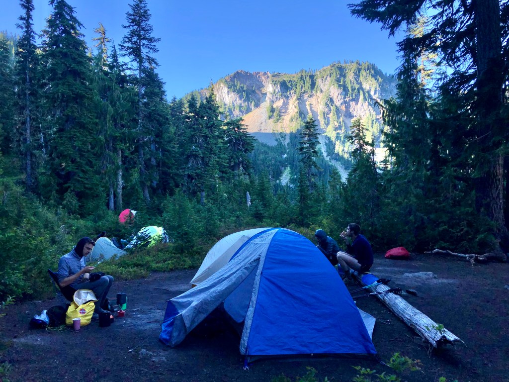 This wasn’t a surprise given that we went over the long weekend, but the lake was busy. Keeping in mind the Leave No Trace principles, it took a while, but we eventually found a campsite on a durable surface to protect the fragile alpine meadows. If you’re in a pinch to find flat ground and are willing to sacrifice privacy, there is a large clearing with lots of space for camping at Marmot Lake just past the vault toilet.
