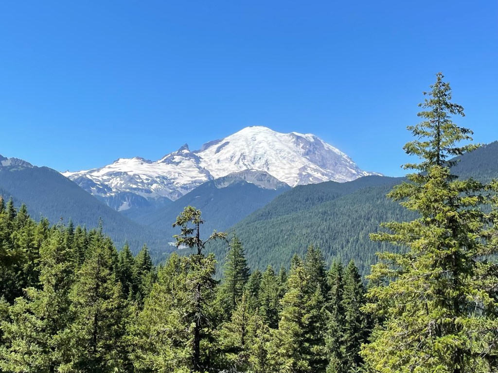 Start at the Crystal Lake Trailhead on the side of Highway 410. After 1.3 miles and 1600 feet of elevation gain, you’ll reach your first junction, intersecting the Crystal Peak Trail. Continue on straight. Shortly after the junction, you’ll see the fullest view of Rainier you’ll get (the view from Sourdough Ridge will get you a glimpse of the summit) so this makes for a great snack break.